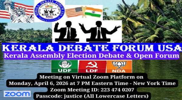 Byപി പി ചെറിയാൻMarch 30, 2026ഹ്യൂസ്റ്റണ്: ചൂടേറിയ കേരളാ അസംബ്ലി തെരഞ്ഞെടുപ്പ് പ്രചാരണങ്ങള് തിരുതകൃതിയായി നടക്കുന്ന ഈ അവസരത്തില്, താല്പര്യമുള്ള അമേരിക്കന് മലയാളികള്ക്കായി കേരള ഡിബേറ്റ് ഫോറം യു എസ് എ, ആഭിമുഖ്യത്തില്, വിജ്ഞാനപ്രദവും രാഷ്ട്രീയ ബോധവല്ക്കരണത്തിന്...
