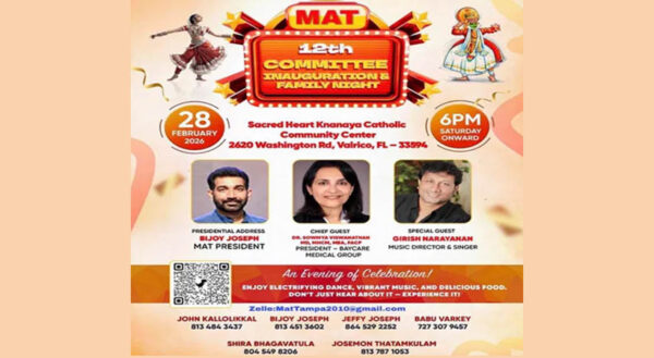 ടാമ്പാ: മലയാളി അസോസിയേഷന്‍ ഓഫ് ടാമ്പായുടെ (MAT) പന്ത്രണ്ടാമത് കമ്മറ്റിയുടെ പ്രവര്‍ത്തനോദ്ഘാടനവും, കുടുംബസംഗമവും സംയുക്തമായി ആഘോഷിക്കുന്നതിനുള്ള ഒരുക്കങ്ങള്‍ പൂര്‍ത്തിയായതായി. ഫെബ്രുവരി 28-നു ശനിയാഴ്ച  ആറുമണിയോടു കൂടി ക്‌നാനായ കമ്മ്യൂണിറ്റി സെന്ററില്‍ ആരംഭിക്കുന്ന...