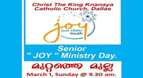 ByStaff ReporterFebruary 27, 2026ഡാളസ് ക്രിസ്തുരാജൻ ക്നാനായ കത്തോലിക്ക ഇടവകയിലെ സീനിയർ ജോയ് മിനിസ്ട്രിയുടെ നേതൃത്വത്തിൽ “മുറ്റത്തെ മുല്ല” സംഗമം മാർച്ച് 1 ഞായറാഴ്ച വിവിധവും പുതുമയാർന്നതുമായ പരിപാടികളോടെ നടത്തപെടുന്നു. സീനിയർ ഗ്രൂപ്പ് അംഗങ്ങളുടെ നേതൃത്വത്തിൽ...
