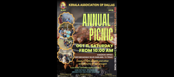 Byപി പി ചെറിയാൻOctober 6, 2025ഡാളസ് :ഡാളസിലെ കേരള അസോസിയേഷൻ വാർഷിക പിക്നിക് ഒക്ടോബർ 11, ശനി KAD / ICEC ഓഫീസിന്റെ ഗ്രൗണ്ടിൽ വെച്ച് (3821 Broadway Blvd, Garland, TX 75043, USA)രാവിലെ 10:00...