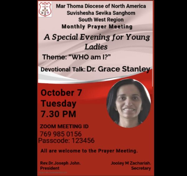 Byപി പി ചെറിയാൻOctober 7, 2025ഡാളസ്:നോർത്ത് അമേരിക്ക മാർത്തോമാ ഭദ്രാസന സൗത്ത് വെസ്റ്റ് റീജിയൻ സുവിശേഷ സേവിക സംഘം, യുവതികൾക്കായി പ്രത്യേക നടത്തപ്പെടുന്ന പ്രയർ മീറ്റിംഗ് ഒക്ടോബർ 7 ചൊവ്വ വൈകിട്ട് 7.30ന് (സൂം വഴിയായി)സംഘടിപ്പിക്കുന്നു.“Who am...