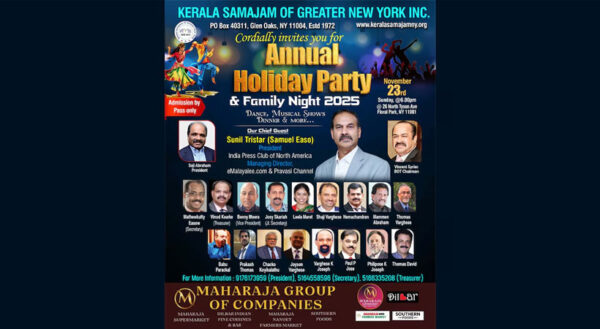 Byപി പി ചെറിയാൻNovember 3, 2025ന്യൂയോർക്ക്: കേരളാ സമാജം ഓഫ് ഗ്രേയ്റ്റർ ന്യൂയോർക്കിന്റെ അൻപത്തിമൂന്നാമത് വാർഷികത്തിന്റെ ഭാഗമായി വാർഷിക ഡിന്നറും ഫാമിലി നൈറ്റും 23ന് സംഘടിപ്പിക്കുവാനുള്ള ക്രമീകരണങ്ങൾ പുരോഗമിക്കുന്നു. 23ന് ഞായറാഴ്ച വൈകിട്ട് 5:30 മുതൽ ഫ്ലോറൽ...