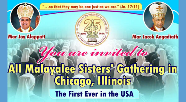ചിക്കാഗോ: സിറോ മലബാർ ചിക്കാഗോ രൂപതയുടെ ഇരുപത്തിയഞ്ചാം വാർഷികാഘോഷങ്ങളുടെ ഭാഗമായി അമേരിക്കയിൽ ‘ഓൾ മലയാളി സിസ്റ്റേഴ്സ് സംഗമം’ 2026, ഏപ്രിൽ 17, 18 തീയതികളിൽ ചിക്കാഗോയിൽ അരങ്ങേറും. അമേരിക്കയിലെ സേവനമനുഷ്ഠിക്കുന്ന മലയാളി...