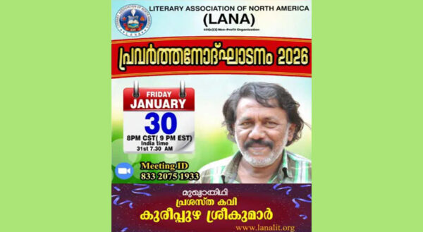 ByStaff ReporterJanuary 27, 2026ഡാളസ് : ലിറ്റററി അസോസിയേഷൻ ഓഫ് നോർത്ത് അമേരിക്ക( ലാന)യുടെ 2026 വർഷത്തെ പ്രവർത്തന ഉദ്ഘാടനം ജനുവരി 30 ന് വൈകിട്ട് 8 മണിക്ക് ( 8PM CST / 9...