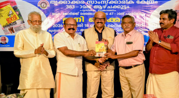ByStaff ReporterJanuary 19, 2026കൊച്ചി: ഡോ. ജോര്ജ് മരങ്ങോലിയുടെ 47 – മത് പുസ്തകം ‘ ഇനി ഒരിക്കല്,’ (ചെറുകഥാസമാഹാരം) തൃക്കാക്കര സാംസ്കാരിക കേന്ദ്രത്തിന്റെ 383- മത് ആഴ്ചക്കൂട്ടത്തില്, ഓണം പാര്ക്കില് വച്ച് പ്രകാശനം ചെയ്തു....