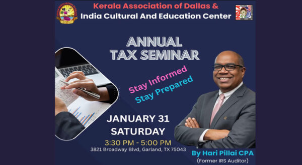 ByStaff ReporterJanuary 19, 2026ഡാളസ് : കേരള അസോസിയേഷൻ ഓഫ് ഡാളസും ഇന്ത്യ കൾച്ചറൽ ആൻഡ് എഡ്യൂക്കേഷൻ സെന്ററും സംയുക്തമായി സംഘടിപ്പിക്കുന്ന വാർഷിക ടാക്സ് സെമിനാർ ജനുവരി 31 ശനിയാഴ്ച നടക്കും. പുതിയ നികുതി നിയമങ്ങൾ,...