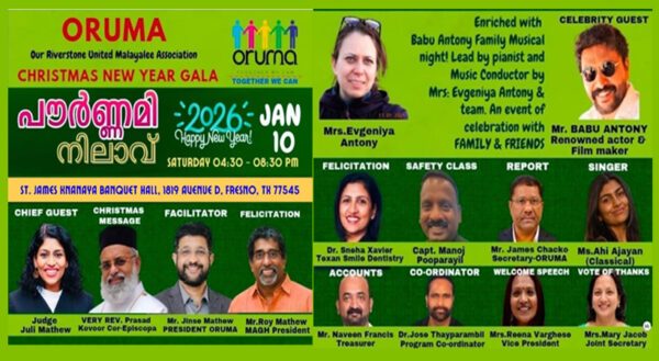 ByStaff ReporterJanuary 6, 2026ഹൂസ്റ്റൺ:റിവർസ്റ്റോൺ മലയാളി അസോസിയേഷനായ ഒരുമയുടെ പതിനഞ്ചാം വാർഷികവും ക്രിസ്മസ്/ന്യൂ ഇയർ ഗാലയായ “പൗർണ്ണമി നിലാവും” ജനുവരി പത്ത് ശനിയാഴ്ച്ച വൈകുന്നേരം 4.30 മുതൽ 8.30 വരെ സെൻറ് ജയിംസ് ക്നാനായ ബാങ്കറ്റ്...