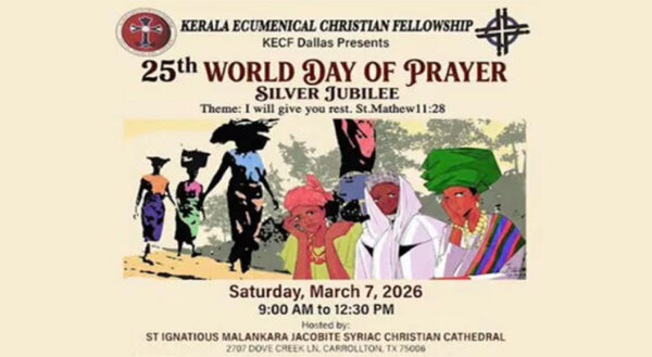 ByStaff ReporterMarch 5, 2026ഡാളസ് : കേരള എക്യുമെനിക്കൽ ക്രിസ്ത്യൻ ഫെല്ലോഷിപ്പ് ഡാലസിന്റെ ആഭിമുഖ്യത്തിൽ 25-ാമത് ലോക പ്രാർത്ഥനാ ദിനവും സിൽവർ ജൂബിലി ആഘോഷങ്ങളും സംഘടിപ്പിക്കുന്നു. 2026 മാർച്ച് 7 ശനിയാഴ്ച രാവിലെ 9:00 മുതൽ...