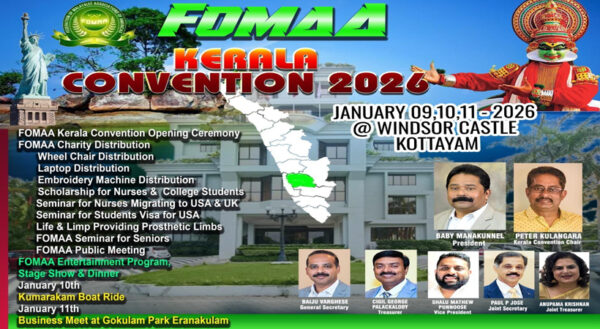 ByStaff ReporterDecember 29, 2025കോട്ടയം: സമൂഹത്തില് പ്രയാസം അനുഭവിക്കുന്നവരെ ഹൃദയത്തോട് ചേര്ത്തുനിര്ത്തി അവര്ക്ക് സമാശ്വാസം പകരുന്ന മഹത്തായ ജീവകാരുണ്യ പ്രവര്ത്തനത്തിന് പ്രാമുഖ്യം നല്കിക്കൊണ്ടുള്ള ഫോമാ കേരള കണ്വന്ഷന്റെ ഒരുക്കങ്ങള് പൂര്ത്തിയായെന്നും കണ്വന്ഷന് ചാരിറ്റിയുടെ ചരിത്രമാകുമെന്നും കണ്വന്ഷന്...