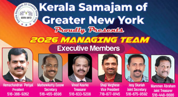 ByStaff ReporterDecember 24, 2025ന്യൂയോർക്ക്: അമേരിക്കയിലെ ആദ്യത്തെ മലയാളി സംഘടനയായ, കേരളാ സമാജം ഓഫ് ഗ്രേറ്റര് ന്യൂയോര്ക്കിന്. 2026 ലേക്കുള്ള പുതിയ ഭാരവാഹികളെ, ഡിസംബര് 13, 2025 ശനിയാഴ്ച, ട്ടൈയ്സെണ് സെന്ററില് വച്ച് നടന്ന ജനറല്...