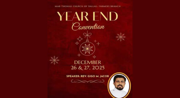 ByStaff ReporterDecember 25, 2025ഡാലസ്: മാർത്തോമ്മാ ചർച്ച് ഓഫ് ഡാലസ് ഫാർമേഴ്സ് ബ്രാഞ്ച് ഇടവകമിഷന്റെ നേതൃത്വത്തിലുള്ള വർഷാന്തര കൺവെൻഷനും ഉപവാസ പ്രാർത്ഥനയും ഡിസംബർ 26 (നാളെ) മുതൽ 27 വരെയുള്ള ദിവസങ്ങളിൽ (വെള്ളി, ശനി) വൈകുന്നേരം...