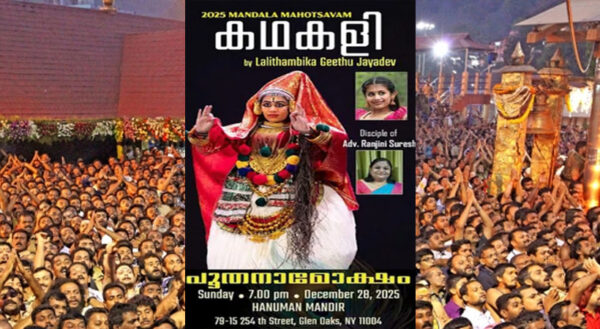 ByStaff ReporterDecember 23, 2025ന്യൂയോർക്ക്: കേരള ഹിന്ദൂസ് ഓഫ് നോർത്ത് അമേരിക്കയുടെയും, മറ്റു വിവിധ ഹിന്ദു സംഘടനകളുടെയും സഹകരണത്തോടെ, ന്യൂയോർക്ക് അയ്യപ്പ സേവാസംഘം മണ്ഡല കാല മഹോത്സവം സംഘടിപ്പിക്കുന്നു. അയ്യപ്പ പൂജ, മ്യൂസിക് കൺസർട്ട്, ഹരിവരാസനം...