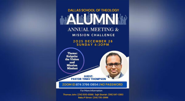 ByStaff ReporterDecember 13, 2025ഡാലസ്: ക്രൈസ്തവ ശുശ്രൂഷാ രംഗത്ത് നിർണായക സ്വാധീനം ചെലുത്തുന്ന ഡാലസ് സ്കൂൾ ഓഫ് തിയോളജി പൂർവ വിദ്യാർഥി അസോസിയേഷന്റെ (Alumni Association) ഈ വർഷത്തെ വാർഷിക സമ്മേളനം 2025 ഡിസംബർ 28ന്....