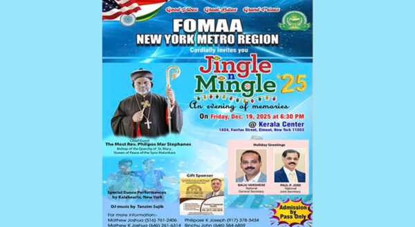 ByStaff ReporterDecember 13, 2025ന്യൂയോര്ക്ക്: പൊതുജന ശ്രദ്ധ ആകര്ഷിച്ച വൈവിധ്യങ്ങളായ പരിപാടികള് കാഴ്ച്ച വച്ച ഫോമാ ന്യൂയോര്ക്ക് മെട്രോ റീജിയണ് ഈ ഹോളിഡേ സീസണ് ആഘോഷമാക്കുവാന് ‘ജിംഗിള് മിംഗിള്’ എന്ന പരിപാടി ഏവര്ക്കുമായി കാഴ്ച വയ്ക്കുന്നു....