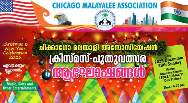 ByStaff ReporterDecember 9, 2025ചിക്കാഗോ : ചിക്കാഗോ മലയാളി അസോസിയേഷന്റെ ആഭിമുഖ്യത്തില് നടത്തപ്പെടുന്ന ക്രിസ്മസ് പുതുവത്സരാഘോഷങ്ങള് ഡിസംബര് 28 ന് വൈകിട്ട് 6 മണിക്ക് ഡെസ്പ്ലെയിന്സിലുള്ള ക്നാനായ സെന്റര് ഓഡിറ്റോറിയത്തില് വെച്ച് നടത്തപ്പെടുന്നതാണ്. ക്രിസ്മസ് ഗാനാലാപനം,...