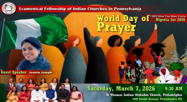 ByStaff ReporterFebruary 19, 2026ഫിലാഡൽഫിയ: സമൂഹ നന്മയ്ക്കും ആത്മീയ നവീകരണത്തിനും ക്രിസ്തീയ ഐക്യത്തിനുമായി പ്രവര്ത്തിച്ചുവരുന്ന എപ്പിസ്കോപ്പൽ സഭകളുടെ കൂട്ടായ്മയായ എക്യൂമെനിക്കല് ഫെല്ലോഷിപ് ഓഫ് ഇന്ഡ്യന് ചര്ച്ചസ് ഇന് പെൻസിൽവാനിയ വനിതാഫോറത്തിന്റെ നേതൃത്വത്തിൽ ലോക പ്രാര്ത്ഥനാദിനം മാർച്ച്...