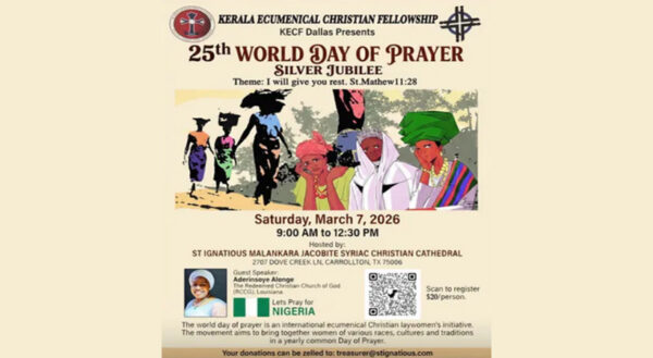 ByStaff ReporterFebruary 19, 2026ഡാളസ് : കേരള എക്യുമെനിക്കൽ ക്രിസ്ത്യൻ ഫെല്ലോഷിപ്പ് ഡാലസിന്റെ ആഭിമുഖ്യത്തിൽ 25-ാമത് ലോക പ്രാർത്ഥനാ ദിനവും സിൽവർ ജൂബിലി ആഘോഷങ്ങളും സംഘടിപ്പിക്കുന്നു. 2026 മാർച്ച് 7 ശനിയാഴ്ച രാവിലെ 9:00 മുതൽ...