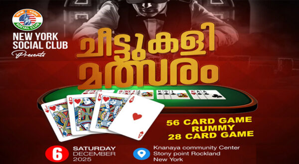 Byപി പി ചെറിയാൻNovember 21, 2025റോക് ലൻഡ്: ന്യൂയോർക്ക് സോഷ്യൽ ക്ലബ്ബ് സംഘടിപ്പിക്കുന്ന ചീട്ടുകളി മത്സരം ഡിസംബർ 6-ന് നടത്തപ്പെടുന്നു. കായിക പ്രേമികളെ ആവേശത്തിലാഴ്ത്തിയ ടഗ്-ഓഫ്-വാർ ടൂർണമെന്റിന്റെ വിജയത്തിന് ശേഷം ക്ലബ്ബ് ഒരുക്കുന്ന കാർഡ് ഗെയിംസ് ടൂർണമെന്റിന്...