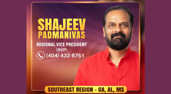ByStaff ReporterNovember 21, 2025അറ്റ്ലാന്റ (ജോർജിയ) : കേരള ഹിന്ദൂസ് ഓഫ് നോർത്ത് അമേരിക്ക (കെഎച്ച്എൻഎ)യുടെ സൗത്ത് ഈസ്റ്റ് റീജനൽ വൈസ് പ്രസിഡന്റായി (ആർ.വി.പി) ഷജീവ് പത്മനിവാസ് ചുമതലയേറ്റു. ജോർജിയ, അലബാമ, മിസിസിപ്പി (ജി.എ, എ.എൽ,...