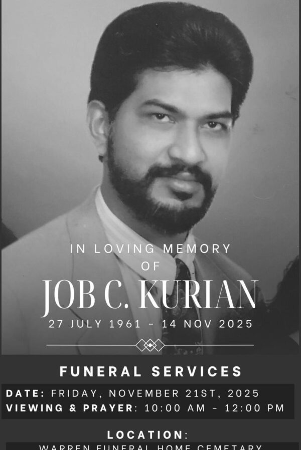 Byപി പി ചെറിയാൻNovember 20, 2025ഗർനി (ഇല്ലിനോയി): ജോബ് സി. കുര്യൻ (64) നിര്യാതനായി. 2025 നവംബർ 14-നായിരുന്നു അന്ത്യം.സംസ്കാര ശുശ്രൂഷകളും പൊതുദർശനവും 2025 നവംബർ 21 വെള്ളിയാഴ്ച രാവിലെ 10 മണി മുതൽ ഉച്ചയ്ക്ക് 12...