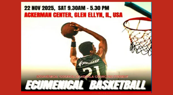 ByStaff ReporterNovember 19, 2025ചിക്കാഗോ: ചിക്കാഗോ എക്യൂമെനിക്കല് കൗണ്സിലിന്റെ ആഭിമുഖ്യത്തില് നടത്തപ്പെടുന്ന ബാസ്കറ്റ് ബോള് ടൂര്ണമെന്റിന്റെ ഒരുക്കങ്ങള് പൂര്ത്തിയായതായി ഭാരവാഹികള് അറിയിക്കുന്നു. നവംബര് 22, 2025 ശനിയാഴ്ച രാവിലെ 9.30 മുതല് 5 30 pm...