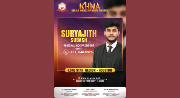 ByStaff ReporterNovember 15, 2025ഹൂസ്റ്റൺ: കേരള ഹിന്ദൂസ് ഓഫ് നോർത്ത് അമേരിക്ക(KHNA)യുടെ ലോൺ സ്റ്റാർ – ഹൂസ്റ്റൺ റീജനൽ വൈസ് പ്രസിഡന്റായി (RVP) തിരുവനന്തപുരം സ്വദേശിയായ സൂര്യജിത്ത് സുഭാഷ് സ്ഥാനമേറ്റു. നിലവിൽ ടെക്സസിലെ ഹൂസ്റ്റണിൽ താമസിക്കുന്ന...