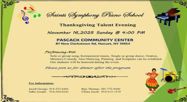 ByStaff ReporterNovember 15, 2025ന്യൂയോര്ക്ക്: റോക്ക്ലാന്ഡ് കൗണ്ടിയില് വാലി കോട്ടേജ് ഓള് സെയിന്റ്സ് എപ്പിസ്കോപ്പല് ചര്ച്ചില് ക്ലാസുകള് നടത്തപ്പെടുന്ന സെയിന്റ്സ് സിഫണി പിയാനോ സ്കൂളിന്റെ നേതൃത്വത്തിലുള്ള താങ്ക്സ് ഗിവിംഗ് ടാലന്റ് ഷോ നവംബര് 16-ന് ഞായറാഴ്ച...