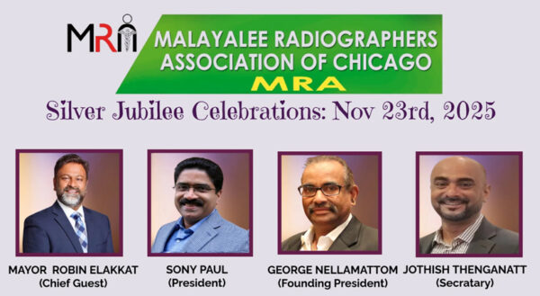 ByStaff ReporterNovember 14, 2025ചിക്കാഗോ: അമേരിക്കൻ മലയാളി റേഡിയോളജി പ്രൊഫഷണലുകളുടെ അഭിമാന സംഘടനയായ മലയാളി റേഡിയോഗ്രാഫേഴ്സ് അസോസിയേഷന്റെ (MRA) രജതജൂബിലി ആഘോഷം (25th Anniversary)2025 നവംബർ 23ന് വൈകുന്നേരം അഞ്ച് മണിയ്ക്ക് നോർത്ത് ബ്രൂക്കിലെ സെഞ്ചുറിയൻ...