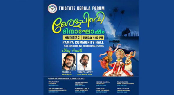 ByStaff ReporterNovember 1, 2025ഫിലഡൽഫിയ: ട്രൈസ്റ്റേറ്റ് കേരള ഫോറം സംഘടിപ്പിക്കുന്ന കേരളപ്പിറവി ദിനാഘോഷം നാളെ (നവംബർ 2) വൈകിട്ട് നാലിന് പമ്പ കമ്മ്യൂണിറ്റി ഹാളിൽ നടക്കും. സംവിധായകൻ സോഹൻലാൽ, നടനും നിർമാതാവും എഴുത്തുകാരനുമായ തമ്പി ആന്റണി...