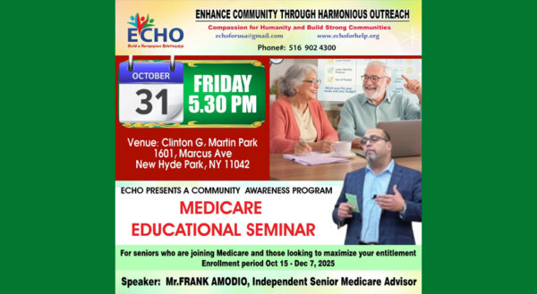 ByStaff ReporterOctober 29, 2025ന്യൂയോര്ക്ക്: ന്യൂഹൈഡ് പാര്ക്ക് ആസ്ഥാനമായി പ്രവര്ത്തിക്കുന്ന ECHO (Enhance Community through Harmonious Outreach) എന്ന ചാരിറ്റി സംഘടന മുതിര്ന്ന പൗരന്മാര്ക്കായി നടത്തുന്ന ‘സീനിയര് വെല്നെസ്സ്’ പ്രോഗ്രാമില് മെഡികെയറിനെ സംബന്ധിച്ച് അറിഞ്ഞിരിക്കേണ്ടതായ...