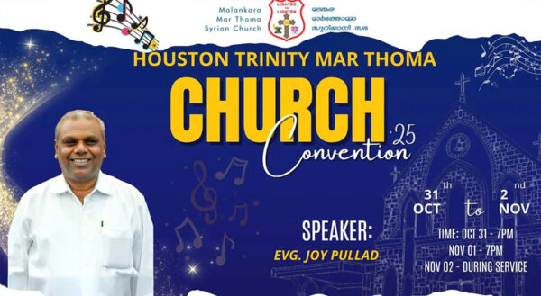 ഹൂസ്റ്റൺ: ഹൂസ്റ്റൺ ട്രിനിറ്റി മാർത്തോമ്മാ ഇടവകയുടെ ആഭിമുഖ്യത്തിൽ ഈ വർഷത്തെ കൺവൻഷൻ ഒക്ടോബർ 31, നവംബർ 1, 2 (വെള്ളി, ശനി, ഞായർ) തീയതികളിൽ നടത്തപ്പെടും. ഞായറാഴ്ച രാവിലെയുള്ള ആരാധന മധ്യേ...