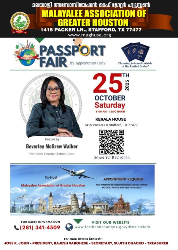 ByStaff ReporterOctober 22, 2025ഹൂസ്റ്റൺ (ടെക്സസ്): ഗ്രേറ്റർ ഹൂസ്റ്റൺ മലയാളി അസോസിയേഷൻ്റെയും (MAGH) ഫോർട്ട് ബെൻഡ് കൗണ്ടി ഡിസ്ട്രിക്ട് ക്ലർക്ക് ബെവർലി മക്ഗ്രെവ് വാൾക്കറുടേയും സംയുക്ത നേതൃത്വത്തിൽ പാസ്പോർട്ട് ഫെയർ സംഘടിപ്പിക്കുന്നു. 2025 ഒക്ടോബർ 25...