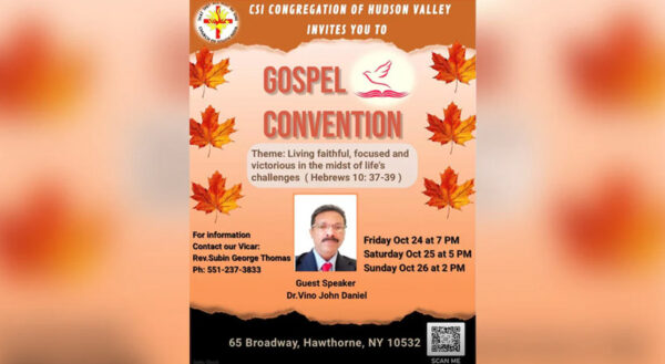 ഹഡ്സൺ വാലി: സിഎസ്ഐ കോൺഗ്രിഗേഷൻ ഓഫ് ഹഡ്സൺ വാലിയുടെ ആഭിമുഖ്യത്തിൽ മൂന്ന് ദിവസം നീണ്ടു നിൽക്കുന്ന ഗോസ്പൽ കൺവൻഷൻ ന്യൂയോർക്കിൽ നടക്കും. ഒക്ടോബർ 24, 25 വൈകിട്ട് 7 മണിക്കും, 26 ഉച്ചയ്ക്ക്...