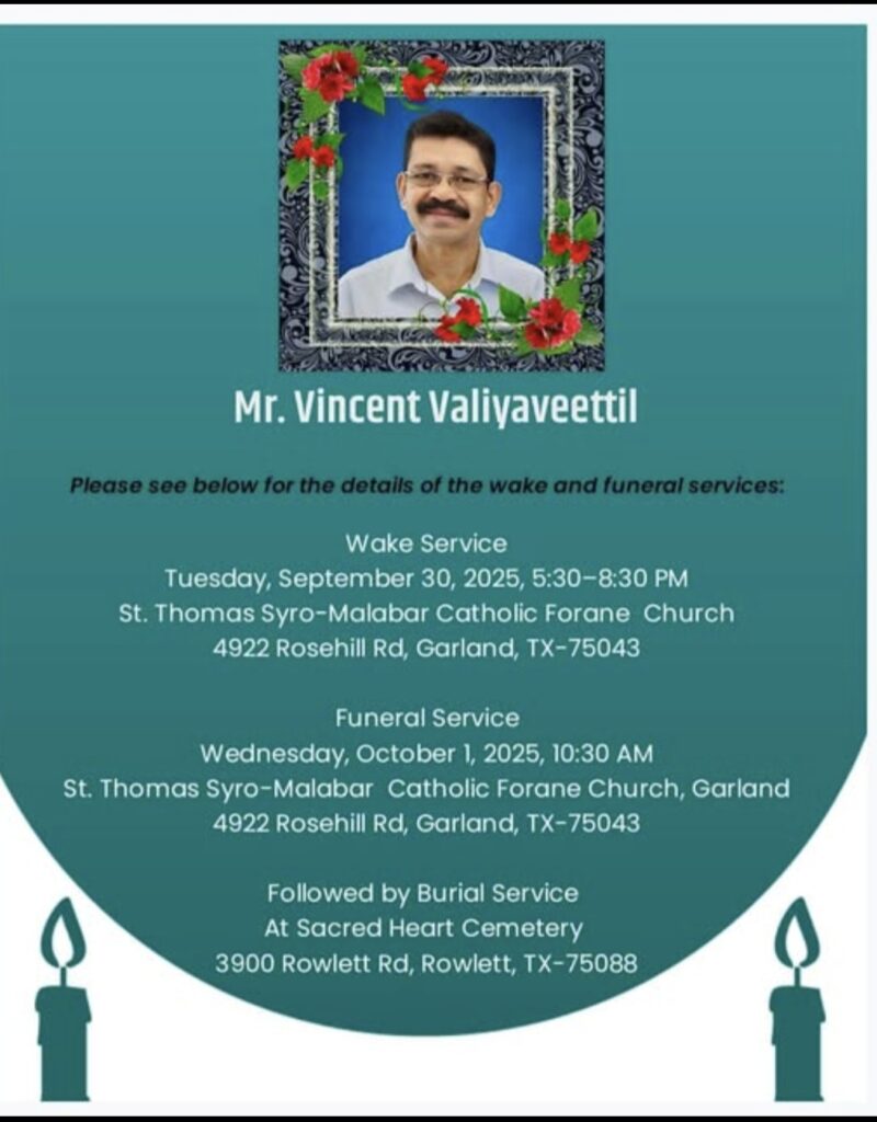 വിൻസെന്റിനെ ഓർക്കുമ്പോൾ, അദ്ദേഹം സൃഷ്ടിച്ച ഐക്യത്തിൽ – അദ്ദേഹത്തിന്റെ സംഗീതം, സൗഹൃദം, സമൂഹത്തോടുള്ള അദ്ദേഹത്തിന്റെ അചഞ്ചലമായ പ്രതിബദ്ധത എന്നിവയിലൂടെ – കുടികൊള്ളുന്ന ഒരു മനുഷ്യനെ ഞങ്ങൾ ആദരിക്കുന്നു. അദ്ദേഹത്തിന്റെ അസാന്നിധ്യം ആഴത്തിൽ അനുഭവപ്പെടും, പക്ഷേ അദ്ദേഹത്തിന്റെ ഓർമ്മ അമേരിക്കയിലെ മലയാളികളുടെ സാംസ്കാരിക യാത്രയ്ക്ക് ഒരു വഴികാട്ടിയായി തുടരും.