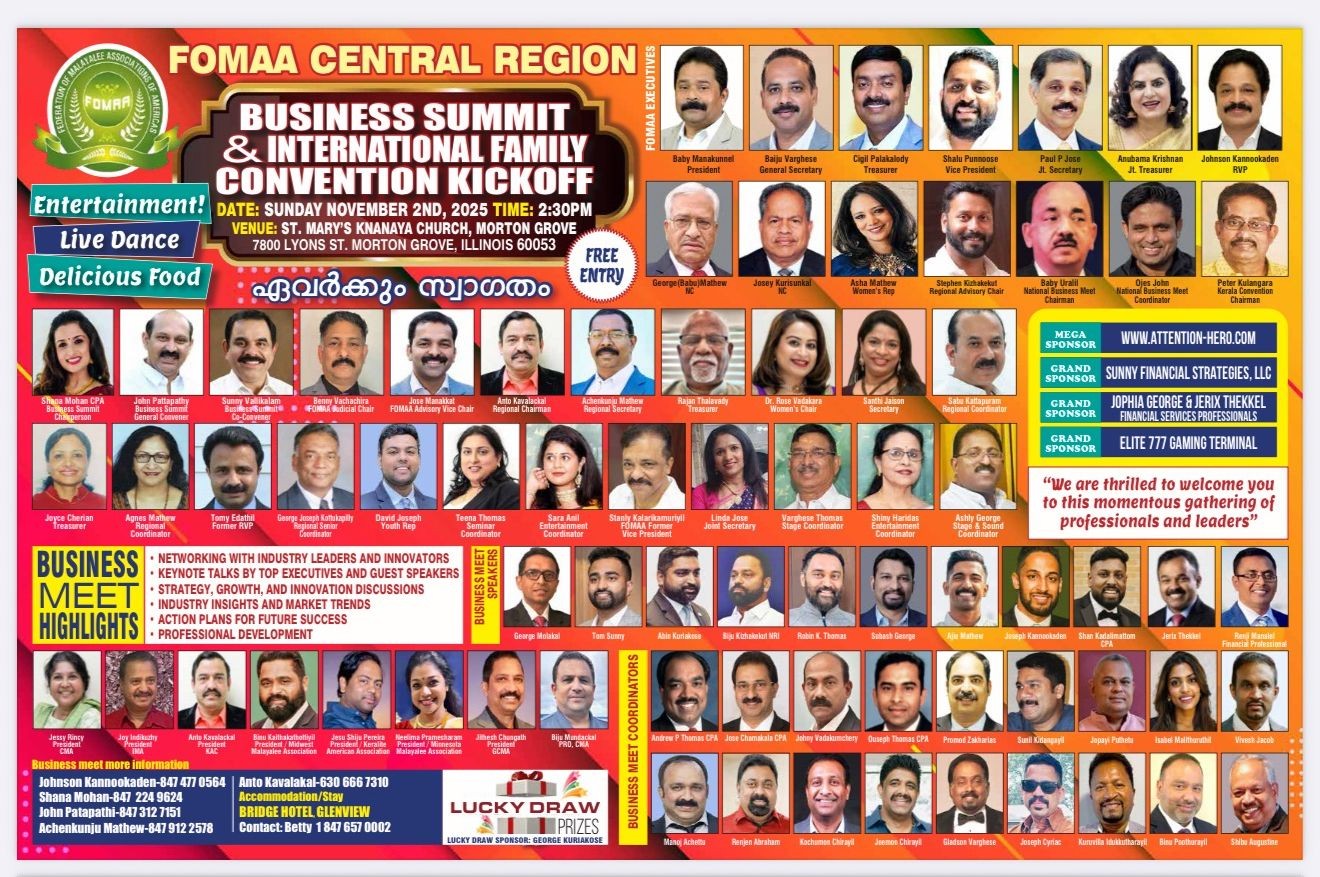 മോർട്ടൺ ഗ്രോവ് (ചിക്കാഗോ): ഫോമാ സെൻട്രൽ റീജിയണിന്റെ ബിസിനസ് സമ്മിറ്റ് ആൻഡ് ഇന്റർനാഷണൽ ഫാമിലി കൺവെൻഷൻ കിക്കോഫ് നവംബർ 2, 2025 ഞായറാഴ്ച നടത്തപ്പെടുന്നു. മോർട്ടൺ ഗ്രോവിലെ സെന്റ് മേരീസ് ക്നാനായ ചർച്ചിലാണ് പ്രൗഢഗംഭീരമായ പരിപാടിക്ക് വേദിയൊരുക്കുന്നത്. ഉച്ചക്ക് 2:30-ന് കിക്കോഫ് ചടങ്ങുകൾ ആരംഭിക്കും.പ്രവേശന ടിക്കറ്റ് ആവശ്യമില്ലാത്ത ഈ പരിപാടിയിലേക്ക് എല്ലാവർക്കും സൗജന്യ പ്രവേശനം ആയിരിക്കും. ബിസിനസ്സ് രംഗത്തെ പ്രമുഖരും സാമൂഹിക-സാംസ്കാരിക നേതാക്കളും ഉൾപ്പെടെ നിരവധി വിശിഷ്ടാതിഥികൾ ചടങ്ങിൽ പങ്കെടുക്കുന്നുണ്ട്.പ്രധാന ആകർഷണങ്ങൾ:ബിസിനസ്സ് മീറ്റ് (Business Meet): വ്യവസായ പ്രമുഖരുമായി നെറ്റ്വർക്കിംഗ് നടത്താനും, നൂതന ആശയങ്ങളും തന്ത്രങ്ങളും ചർച്ച ചെയ്യാനും, നവീകരണത്തിനുള്ള വേദിയൊരുക്കാനും, പ്രൊഫഷണൽ രംഗത്ത് പുരോഗതി കൈവരിക്കാനും ഈ കൂടിക്കാഴ്ച ലക്ഷ്യമിടുന്നു.വിവിധതരം വിനോദ പരിപാടികൾ (Entertainment): തത്സമയ സംഗീത പരിപാടികളും (Live Dance & Delicious Food) രുചികരമായ വിഭവങ്ങളും ചടങ്ങിന് മാറ്റ് കൂട്ടും.
