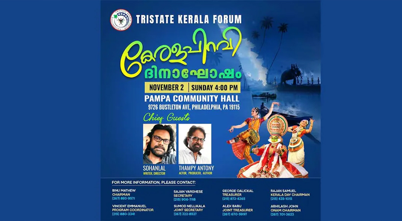 ഫിലഡൽഫിയ: ട്രൈസ്റ്റേറ്റ് കേരള ഫോറം സംഘടിപ്പിക്കുന്ന കേരളപ്പിറവി ദിനാഘോഷം നാളെ (നവംബർ 2) വൈകിട്ട് നാലിന് പമ്പ കമ്മ്യൂണിറ്റി ഹാളിൽ നടക്കും. സംവിധായകൻ സോഹൻലാൽ, നടനും നിർമാതാവും എഴുത്തുകാരനുമായ തമ്പി ആന്റണി എന്നിവർ മുഖ്യാതിഥികളാകും. കേരളീയ കലാരൂപങ്ങളെയും പൈതൃകത്തെയും പ്രമേയമാക്കി വിവിധ സാംസ്കാരിക പരിപാടികൾ അരങ്ങേറും.