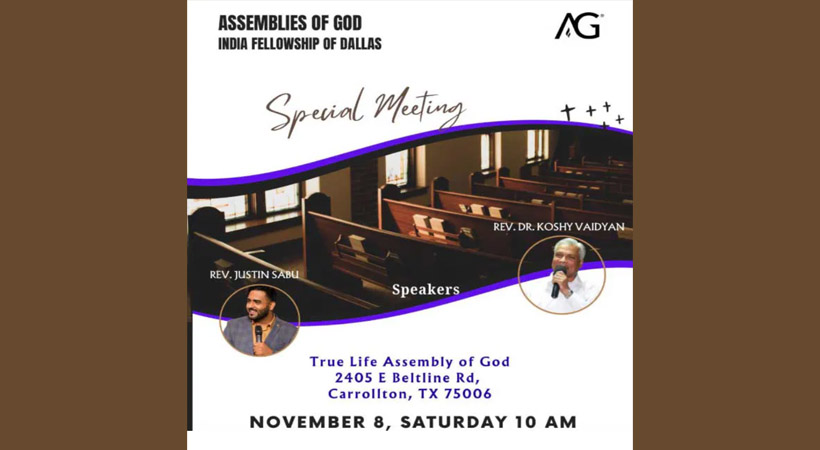 ഡാളസ്: അസംബ്ലീസ് ഓഫ് ഗോഡ് ഇന്ത്യ ഫെലോഷിപ്പ് ഓഫ് ഡാളസിൻ്റെ ആഭിമുഖ്യത്തിൽ ഒരു ഏകദിന സ്പെഷ്യൽ മീറ്റിംഗ് നവംബർ 8 ശനിയാഴ്ച രാവിലെ 10 മണി മുതൽ കരോൾട്ടണിൽ ഉള്ള ട്രൂ ലൈഫ് അസംബ്ലി ഓഫ് ഗോഡ് (2405 E. Beltline Road, Carrollton, TX 75006) സഭാ മന്ദിരത്തിൽ വെച്ച് നടക്കുന്നതാണ്.