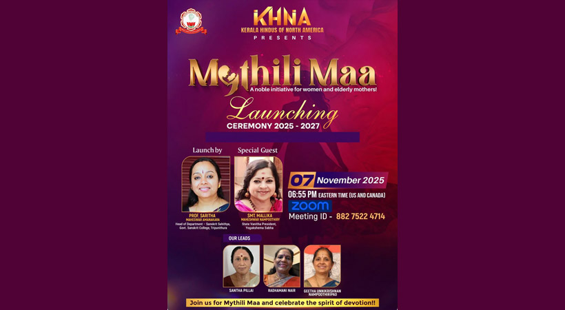 ഫ്ലോറിഡ: കേരള ഹിന്ദൂസ് ഓഫ് നോർത്ത് അമേരിക്കയുടെ (കെ.എച്ച്.എൻ.എ) അഭിമാനകരമായ ആത്മീയ സംരംഭമായ “മൈഥിലി മാ” ലളിതാസഹസ്രനാമാർച്ചന അഞ്ചാം വർഷത്തിലേക്ക് കടക്കുന്നു. കോടി സഹസ്രനാമങ്ങളുടെ പുണ്യപ്രഭയിൽ, പുതിയൊരു അധ്യായം കുറിച്ചുകൊണ്ട് 2025 നവംബർ 7 വെള്ളിയാഴ്ച പരിപാടിക്ക് ഔദ്യോഗികമായി തുടക്കമാകും.