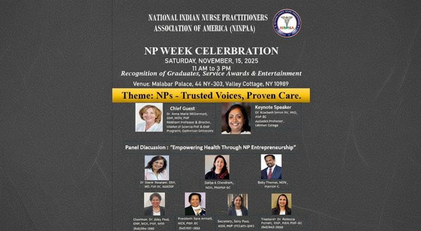 ന്യൂയോർക്: നാഷണൽ ഇന്ത്യൻ നഴ്സ് പ്രാക്ടീഷണർസ് അസോസിയേഷൻ ഓഫ് അമേരിക്ക (NINPAA) സംഘടിപ്പിക്കുന്ന NP വീക്ക് ആഘോഷം നവംബർ 15 ശനിയാഴ്ച രാവിലെ 11 മുതൽ വൈകുന്നേരം 3 വരെ വാലി കോട്ടേജിലെ മലബാർ പാലസ് (44 NY-303) വച്ച് നടക്കും.