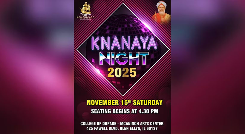 ഇലിനോയ്: ക്നാനായ നൈറ്റ് ഇന്ന് (നവംബർ 15) ഗ്ലെൻ എലനിലെ കോളജ് ഓഫ് ഡ്യൂപേജിൽ അരങ്ങേറും. പരിപാടിയുടെ എല്ലാ ഒരുക്കങ്ങളും പൂർത്തിയായതായി പ്രസിഡന്റ് ജോസ് ആനമല അറിയിച്ചു.