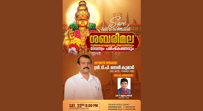 വടക്കെ അമേരിക്കയിലെ മുഴുവൻ ഹൈന്ദവ കൂട്ടായ്മകളും അയ്യപ്പ ഭക്തരും പങ്കെടുക്കുന്ന ഈ ഓൺലൈൻ യോഗത്തിലേക്ക് എല്ലാ സജ്ജനങ്ങളെയും സ്വാഗതം ചെയ്യുന്നതായി സംഘാടകരായ സുരേന്ദ്രൻ നായർ, പ്രസന്നൻ പിള്ള, സിനു നായർ, ശ്രീജിത്ത് ശ്രീനിവാസൻ എന്നിവർ സംയുക്തമായി അറിയിക്കുന്നു.