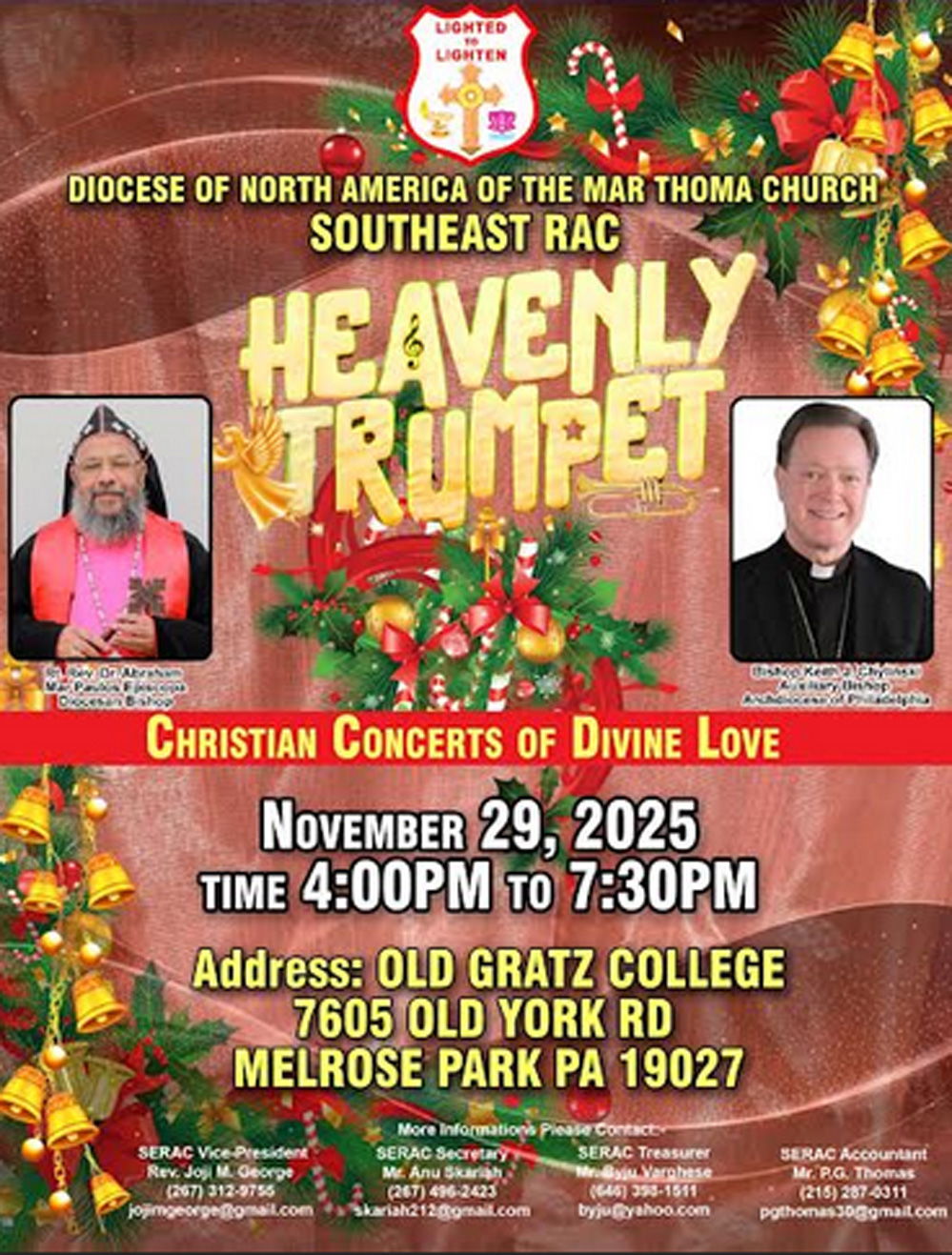 ഫിലഡൽഫിയ : മാർത്തോമാ സഭയുടെ നോർത്ത് അമേരിക്കൻ ഭദ്രാസനത്തിന്റെ ആഭിമുഖ്യത്തിൽ സൗത്ത് ഈസ്റ്റ് റീജനൽ ആക്ടിവിറ്റി കമ്മിറ്റിയും സഭയുടെ സംഗീത വിഭാഗമായ ഡി എസ് എം സി യും സംയുക്തമായി 2025 നവംബർ മാസം 29 ആം തീയതി ശനിയാഴ്ച 4:00 മുതൽ 7 30 വരെ പെൻസിൽവേനിയയിലെ മെല്റോസ് പാർക്കിൽ സ്ഥിതി ചെയ്യുന്ന OLD GRATZ കോളേജ് ഓഡിറ്റോറിയത്തിൽ ( 7605 old York Rd., Melrose Park, PA-19027) വച്ച് നടത്തപ്പെടുന്ന ഹെവൻലി ട്രമ്പറ്റിന്റെ 2025 ഒരുക്കങ്ങൾ പൂർത്തിയായതായി ഭാരവാഹികൾ അറിയിച്ചു.