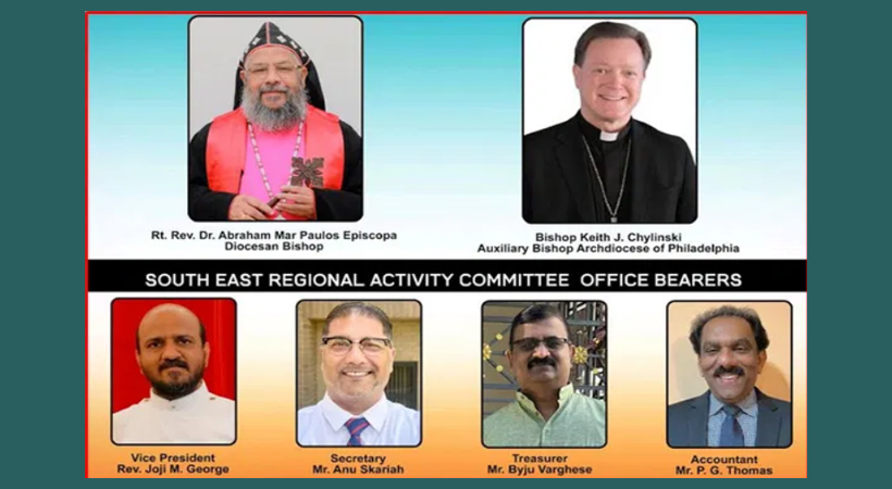 വൈസ് പ്രസിഡണ്ട് റെവ. ജോജി എം ജോർജ്, സെക്രട്ടറി അനു സ്കറിയ സൗത്ത് ഈസ്റ്റ് റീജനൽ ആക്ടിവിറ്റി കമ്മറ്റി അംഗങ്ങൾ- ട്രസ്റ്റി – ബൈജു വർഗീസ്, അക്കൗണ്ടൻറ് – പി .ജി തോമസ് ,