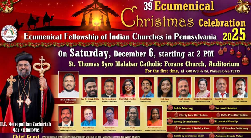 പെൻസിൽവാനിയയിലെ എപ്പിസ്കോപ്പൽ ഇന്ത്യൻ സഭകളുടെ മുപ്പത്തിയൊൻപതാമത് എക്യൂമെനിക്കൽ ക്രിസ്മസ് ആഘോഷങ്ങൾ 2025 ഡിസംബർ 6, ശനിയാഴ്ച ഉച്ചയ്ക്ക് ശേഷം 2 മണി മുതൽ രാത്രി 9 മണി വരെ ഫിലാഡൽഫിയ സീറോ മലബാർ കത്തോലിക്ക പള്ളിയുടെ സെന്റ് അൽഫോൻസാ ഓഡിറ്റോറിയത്തിൽ നടക്കും.