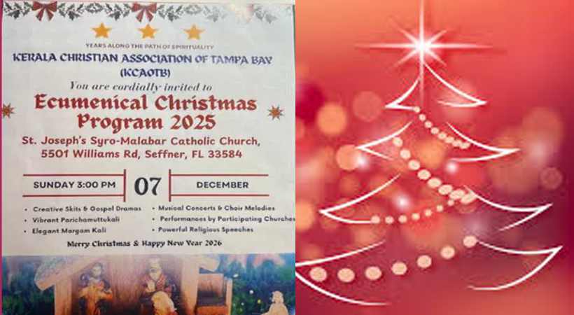 ഡിസംബര് 7 ഞായറാഴ്ച 3 മണിക്ക് സെന്റ് ജോസഫ് സീറോ മലബാര് കാത്തലിക്ക് ദേവാലയഹാളില് (5501 വില്യംസ് റോഡ്, സെഫ്നര്, ഫ്ളോറിഡ, 33584) വച്ച് പ്രാര്ത്ഥനയോടെ പരിപാടികള് ആരംഭിക്കും.