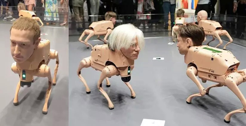 ഫ്ലോറിഡ: ടെക് കോടീശ്വരന്മാരുടെയും പ്രശസ്ത കലാകാരന്മാരുടെയും ഹൈപ്പർ റിയലിസ്റ്റിക് സിലിക്കോൺ മുഖങ്ങളുമായി ഒരു കൂട്ടം ‘നാൽക്കാലി റോബോട്ടുകൾ’ തറയിൽ ചുറ്റിത്തിരിയുന്നു.