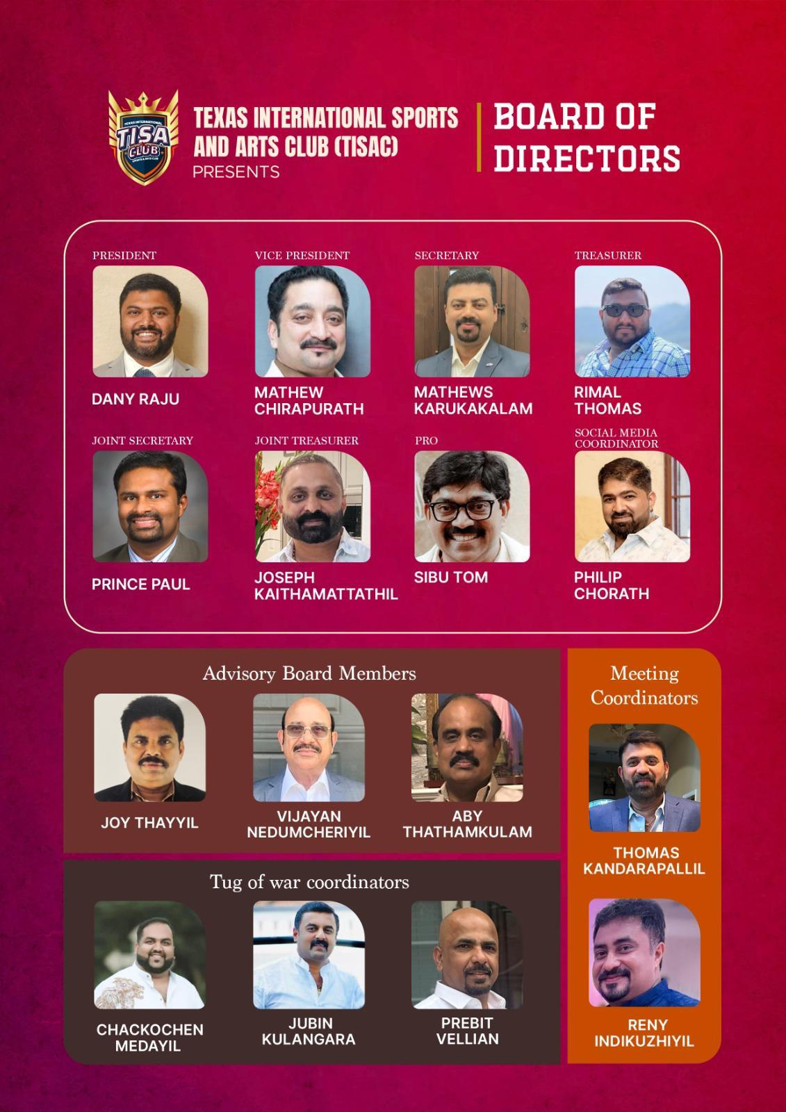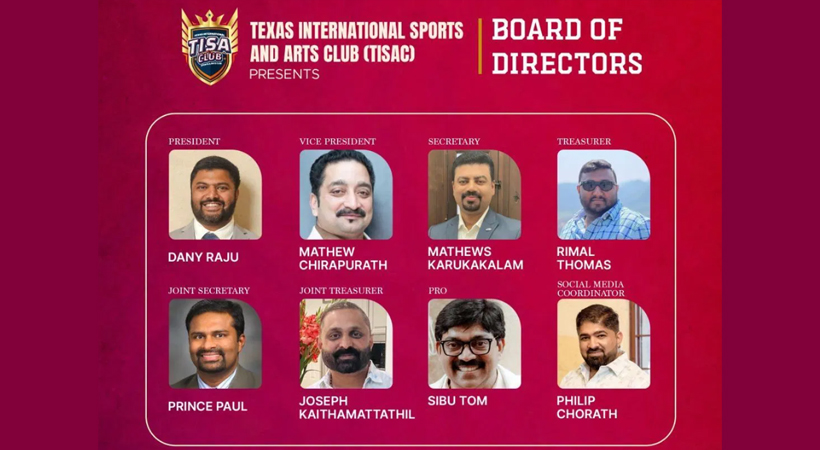 ഹൂസ്റ്റണ് : സംഘാടക മികവ് കൊണ്ടും ജന പങ്കാളിത്തം കൊണ്ടും ശ്രദ്ധയാകര്ഷിച്ച അന്താരാഷ്ട്ര വടംവലിയും വൈവിധ്യവും വ്യത്യസ്തവുമായ മത്സരങ്ങള് കൊണ്ട് ശ്രദ്ധയാകര്ഷിച്ച മൈന്ഡ് & മൂവ്സ് ടൂര്ണമെന്റും സംഘടിപ്പിച്ച് അമേരിക്കയിലെ പ്രമുഖ മലയാളി സംഘടനകളുടെ നിരയിലേക്ക് ഉയര്ന്ന ടെക്സാസ് ഇന്റര്നാഷണല് സ്പോര്ട്സ് ആന്ഡ് ആര്ട്സ് ക്ലബിനെ (TISAC) 2006 ല് നയിക്കാന് ശക്തമായ നേതൃനിരയെ തിരഞ്ഞെടുത്തു.