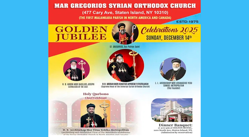 ന്യൂയോര്ക്ക്: അമേരിക്കന് ഐക്യനാടുകളിലെ പ്രഥമ മലങ്കര സുറിയാനി ഓര്ത്തഡോക്സ് ദേവാലയമായ സ്റ്റാറ്റന് ഐലന്റ് മോര് ഗ്രിഗോറിയോസ് ഇടവകയുടെ സുവര്ണ്ണ ജൂബിലി ആഘോഷം സമുചിതമായ പരിപാടികലോടെ ഡിസംബര് 14 ഞായറാഴ്ച നടക്കും. അന്നേദിവസം രാവിലെ നടക്കുന്ന പ്രഭാത പ്രാര്ത്ഥനക്കും വിശുദ്ധ മൂന്നില്മേല് കുര്ബ്ബാനയ്ക്കും അമേരിക്കന് അതിഭദ്രാസനാധിപനും പാത്രിയര്ക്ക വികാരിയുമായ ആര്ച്ച് ബിഷപ്പ് യല്ദോ മോര് തീത്തോസ് തിരുമനസ്സുകൊണ്ട് മുഖ്യകാര്മ്മികത്വം വഹിക്കുന്നതാണ്.