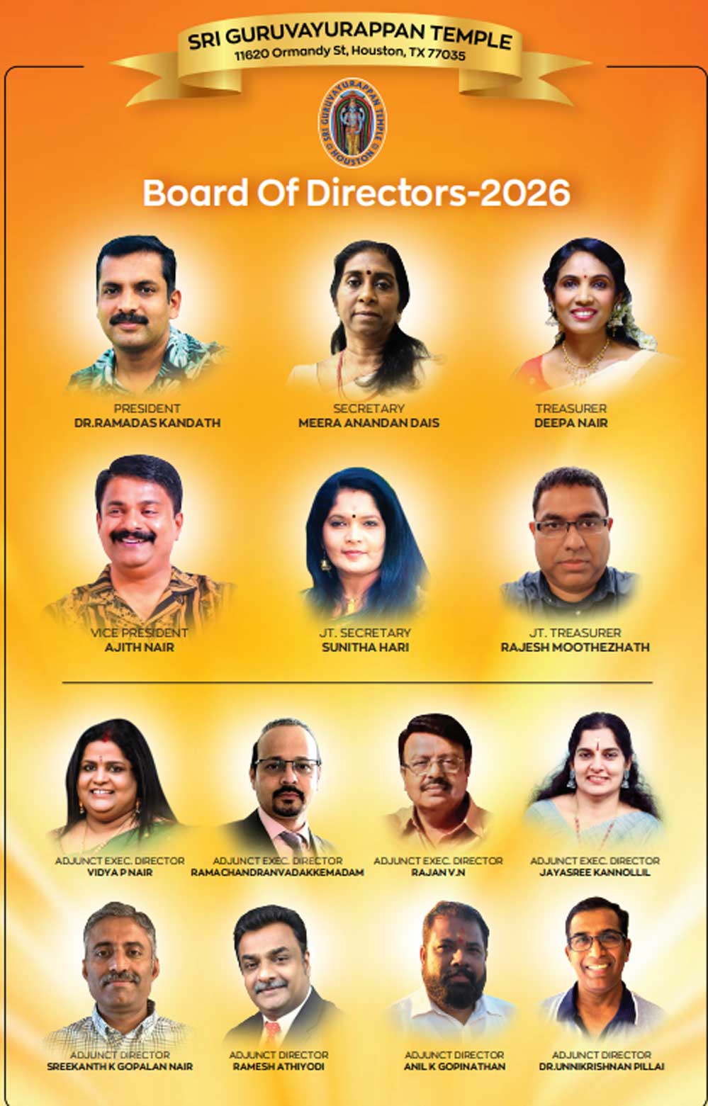 ഹ്യൂസ്റ്റൻ: ഹ്യൂസ്റ്റൺ ശ്രീ ഗുരുവായൂരപ്പൻ ക്ഷേത്രത്തിന്റെ പുതുതായി തിരഞ്ഞെടുക്കപ്പെട്ട ഡയറക്ടർ ബോർഡ് ഔദ്യോഗികമായി ചുമതലയേറ്റു. ധർമ്മം, സേവ, സമൂഹ ഐക്യം എന്നിവയോടുള്ള പുതുക്കിയ പ്രതിബദ്ധതയുടെ പ്രതീകമായ ആത്മീയ ആഘോഷങ്ങളാലും കൂട്ടായ പ്രാർത്ഥനകളാലും ഈ ചടങ്ങ് ശ്രദ്ധേയമായി.