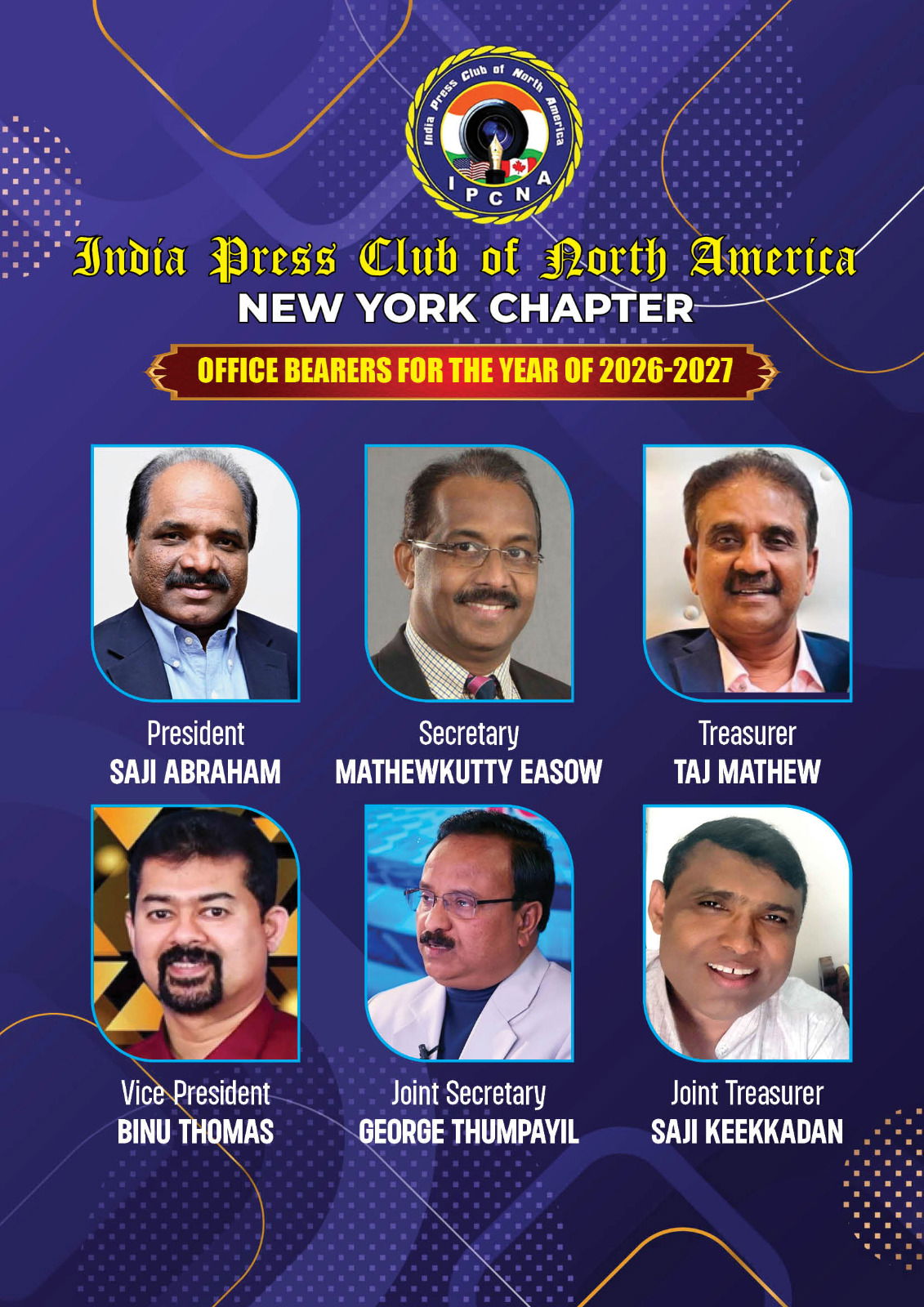 ന്യൂയോര്ക്ക്: കഴിഞ്ഞ രണ്ട് പതിറ്റാണ്ടിലധികമായി പ്രവര്ത്തിക്കുന്ന അമേരിക്കയിലെ മാധ്യമ പ്രവര്ത്തകരുടെ ഏറ്റവും വലിയ സംഘടനയായ ഇന്ത്യാ പ്രസ്സ് ക്ലബ്ബ് ഓഫ് നോര്ത്ത് അമേരിക്കയുടെ (IPCNA) ന്യൂയോര്ക്ക് ചാപ്റ്ററിനെ അടുത്ത രണ്ടു വര്ഷക്കാലം നയിക്കുവാനുള്ള പുതിയ നേതൃത്വത്തെ തെരഞ്ഞെടുത്തു. നിലവിലെ പ്രസിഡന്റ് ഷോളി കുമ്പിളുവേലിയുടെ അദ്ധ്യക്ഷതയില് ഡിസംബര് 21 ഞായറാഴ്ച റോക്ലാന്ഡ് കൗണ്ടിയിലുള്ള മലബാര് പാലസ് റെസ്റ്റോറന്റില് കൂടിയ ന്യൂയോര്ക്ക് ചാപ്റ്റര് ദ്വൈവാര്ഷിക പൊതുയോഗത്തില് വച്ച് 2026-2027 വര്ഷം പ്രസ് ക്ലബ്ബിനെ നയിക്കുവാന് സജി എബ്രഹാമിനെ പ്രസിഡന്റായും, മാത്യുക്കുട്ടി ഈശോയെ സെക്രട്ടറിയായും ടാജ് മാത്യുവിനെ ട്രഷററായും, ബിനു തോമസിനെ വൈസ് പ്രസിഡന്റായും, ജോര്ജ് തുമ്പയിലിനെ ജോയിന്റ് സെക്രട്ടറിയായും, സജി കീക്കാടനെ ജോയിന്റ് ട്രഷററായും ഏകകണ്ഠമായി തെരഞ്ഞെടുത്തു.